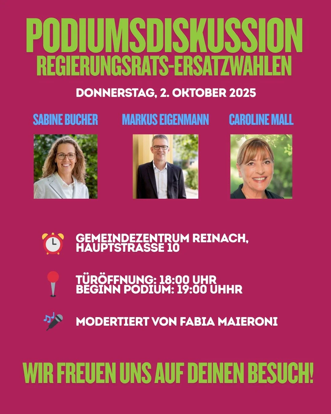 Am Donnerstag, 2. Oktober 2025, findet im Gemeindezentrum Reinach (Hauptstrasse 10) eine öffentliche Podiumsdiskussion zu den Regierungsrats-Ersatzwahlen statt. Gemeinsam mit Markus Eigenmann und Caroline Mall werde ich über unsere Positionen, Vorstellungen und Ziele diskutieren.