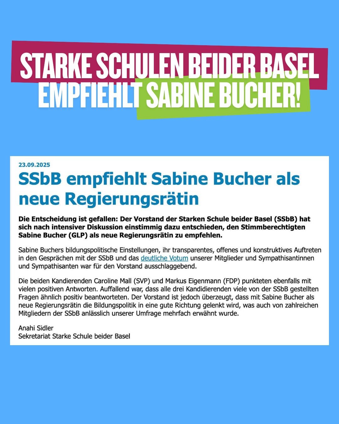 Ich danke der Starken Schule beider Basel (SSbB) von Herzen für ihre einstimmige Empfehlung und das damit ausgesprochene Vertrauen in meine Person und meine bildungspolitischen Überzeugungen.